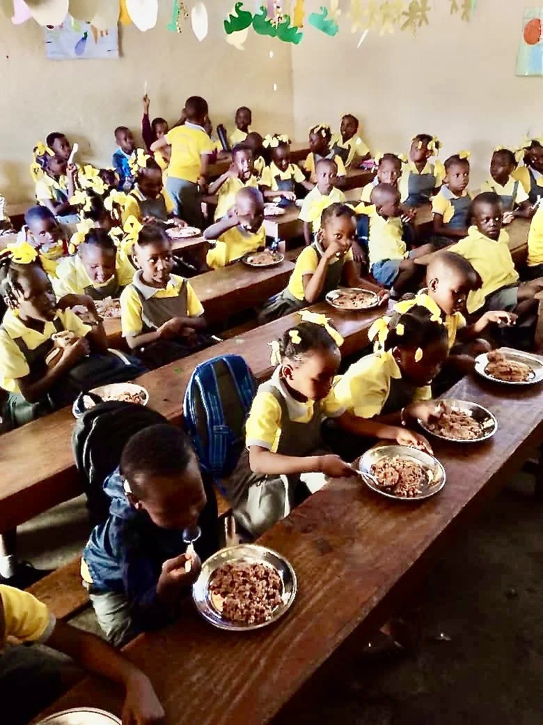 Students enjoying their hot meal of rice and beans at St. Francis de Sales school in Vaudreuil, Northern Haiti